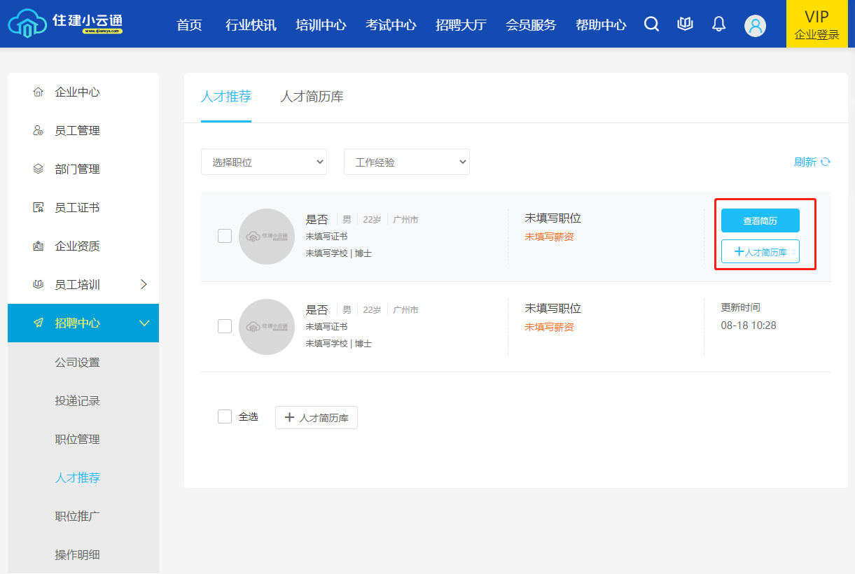 人才推荐 (1)点击人才推荐,系统推荐与企业匹配的优秀人才,可点击“查看简历”和“+人才简历库”;(2)人才简历库显示加入候选的人才简历,可按需搜索,对合适的简历发出“有意向”的通知 上一篇:职位管理 下一篇:职位推广
